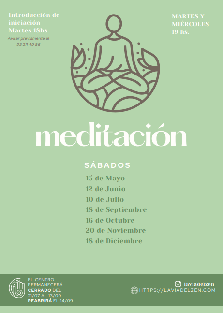 Las personas que quieran practicar regularmente e inscribirse en el programa de práctica de meditación Zen (Zazen) pueden asistir a cualquiera de las clases de nuestro horario, según sus posibilidades. Recuerda que la práctica de la meditación es la verdadera vía de acceso al Zen. Se aconseja escoger un ritmo semanal y periódico para integrar poco a poco la práctica en nuestra vida cotidiana.
